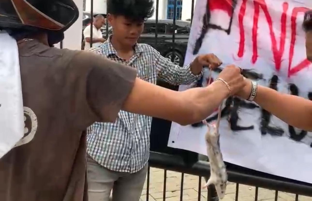 Massa KAMMI Medan melepaskan tikus ke Kantor BBWS Sumatera II dalam aksi unjuk rasa, Selasa (19/8/2025). (istimewa)