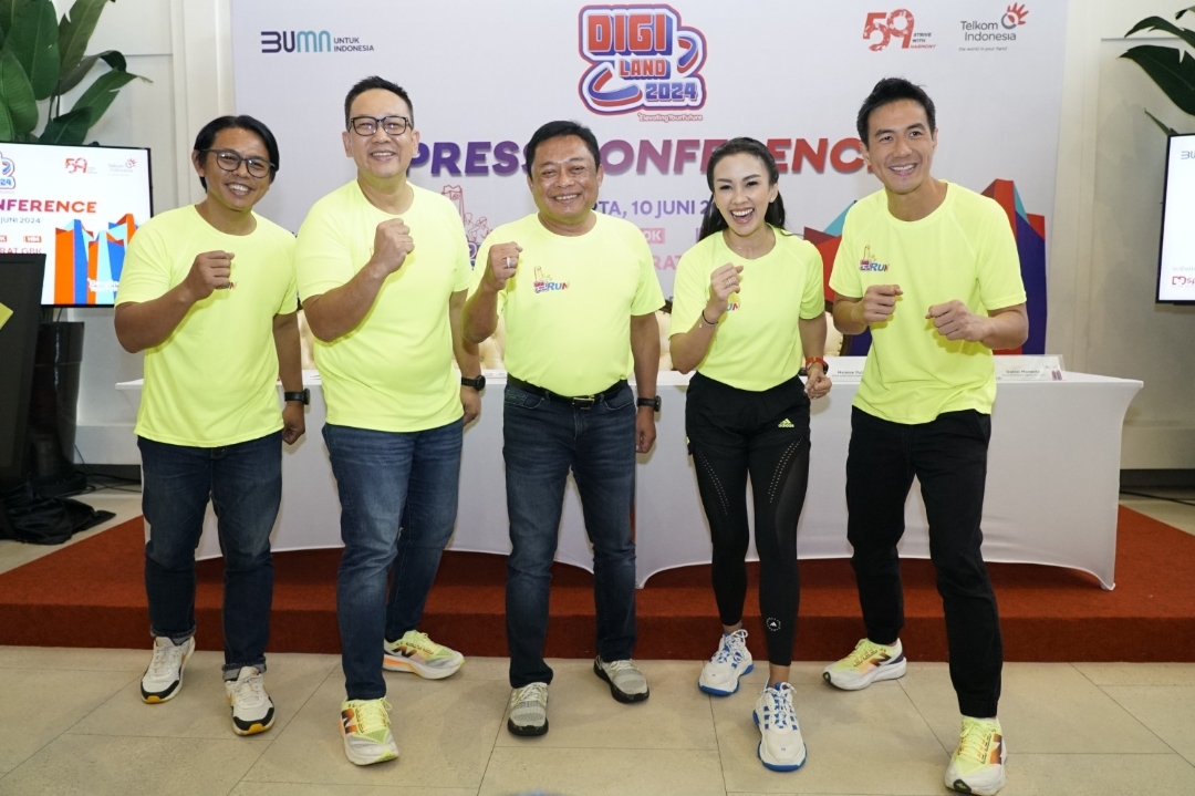 Dirut Telkom Indonesia, Ririek Adriansyah (tengah), SVP Corporate Communication & Investor Relation Telkom, Ahmad Reza (dua kiri), Brand Ambassador Digiland Run 2024, Daniel Mananta (paling kanan) dan Melanie Putria (dua kanan), serta Director D&D Sport, Dardityo Santoso (paling kiri) saat acara press conference Digiland Run 2024 di Jakarta, Senin (10/6/2024). (istimewa)