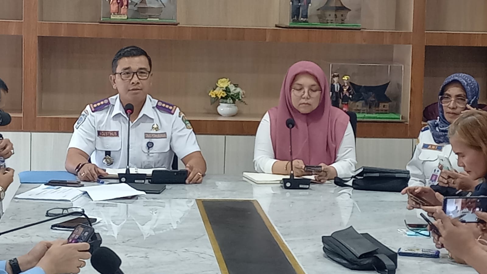 Kadishub Sumut, Agustinus Panjaitan, didampingi Kabid Informasi dan Komunikasi Publik Dinas Kominfo Sumut Harvina Zuhra (tengah), memberikan keterangan kepada wartawan, Rabu (05/04/2023). (rvs)