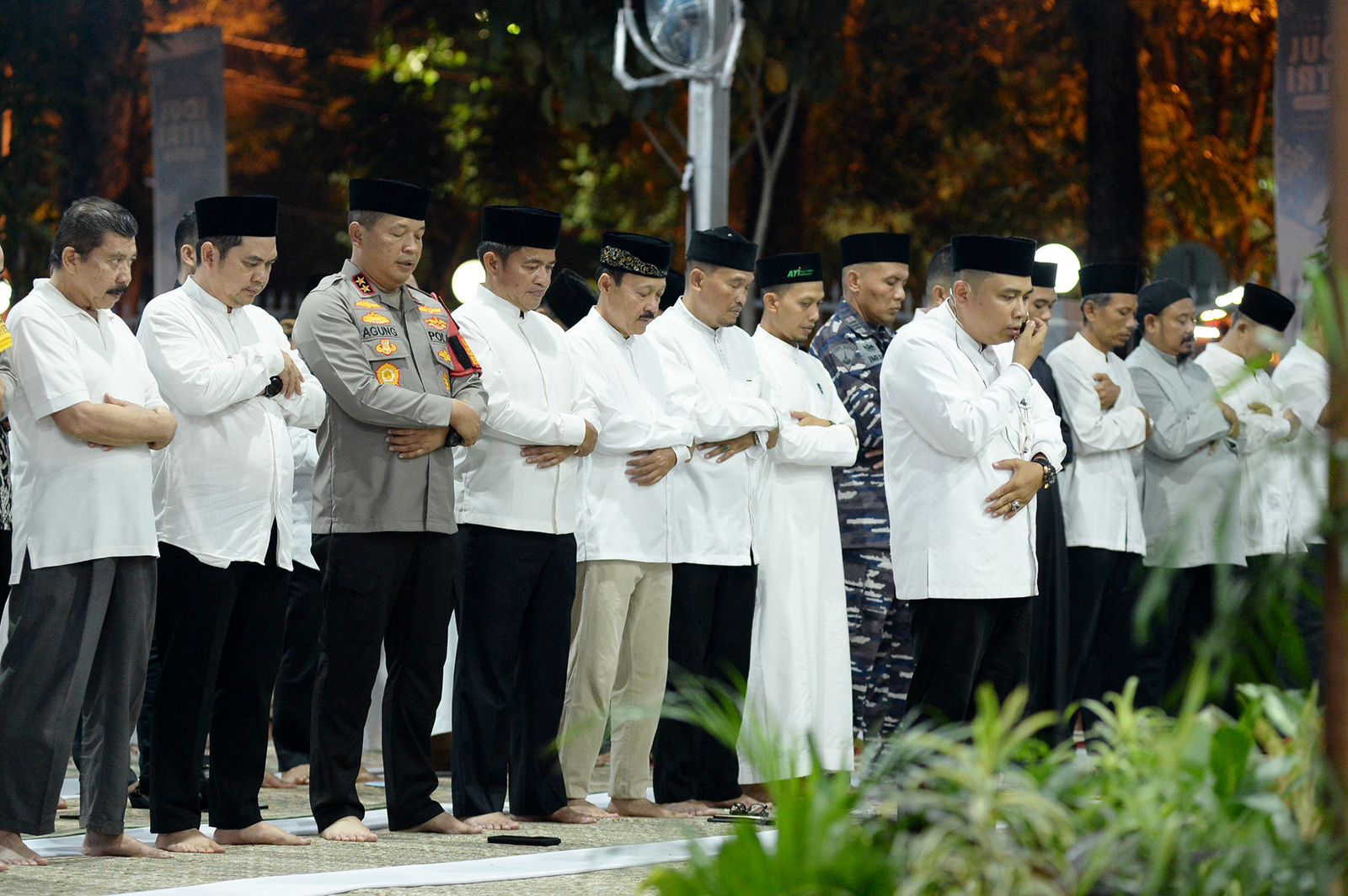 Pj Gubsu Hassanudin melaksanakan Salat Isya berjemaah bersama Forkopimda Provinsi Sumut yang dilanjutkan memukul bedug menandai gema takbir menyambut Hari Raya Idulfitri 1445 H, Selasa (9/4/2024) malam. (istimewa)