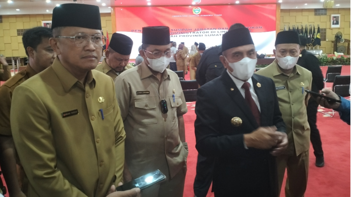 Bambang Pardede saat masih Kadis PUPR Sumut mendampingi Gubernur Sumut, Edy Rahmayadi, usai pelantikan Pejabat Eselon III Pemprov Sumut, pada 14 November 2023. (bps)