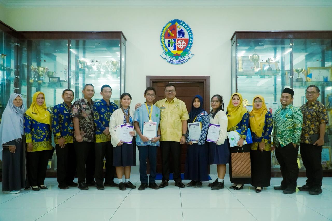Bupati Deli Serdang Asri Ludin Tambunan menerima delegasi siswa berprestasi di Kantor Bupati, Kamis (23/10/2025). (dok/kominfods)
