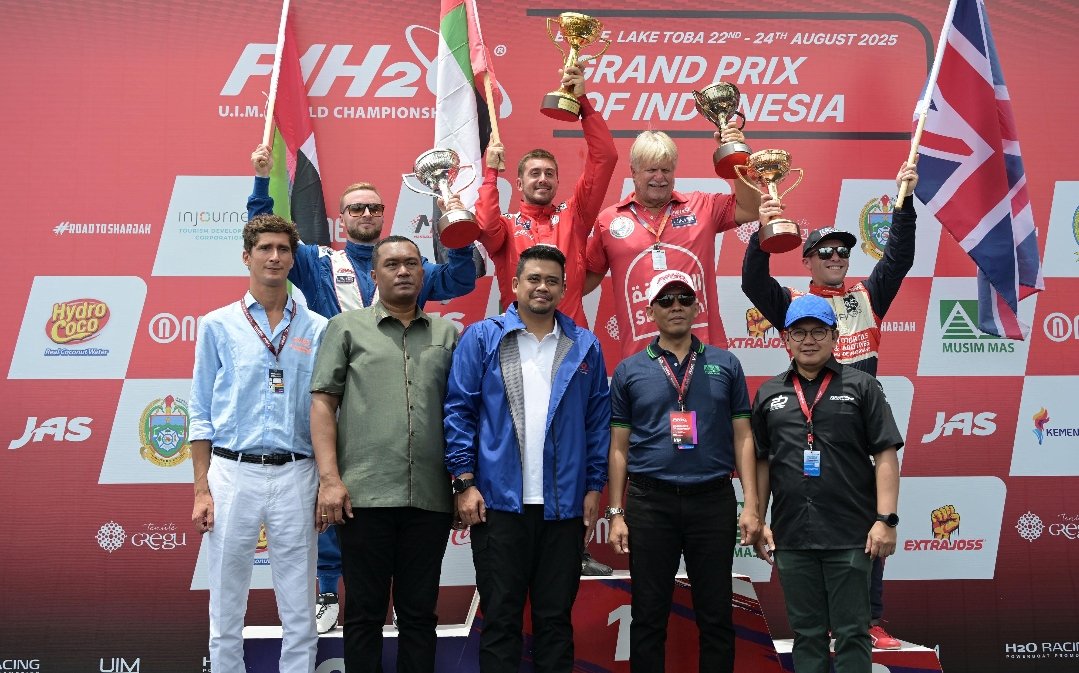 InfraSumut.com – Balige. Gubernur Sumatera Utara (Sumut) Bobby Nasution menyerahkan trofi kepada juara F1 Powerboat GP of Indonesia 2025. Penyerahan ini menandai berakhirnya event F1 Powerboat 2025 yang dimulai 22 Agustus 2025 lalu.