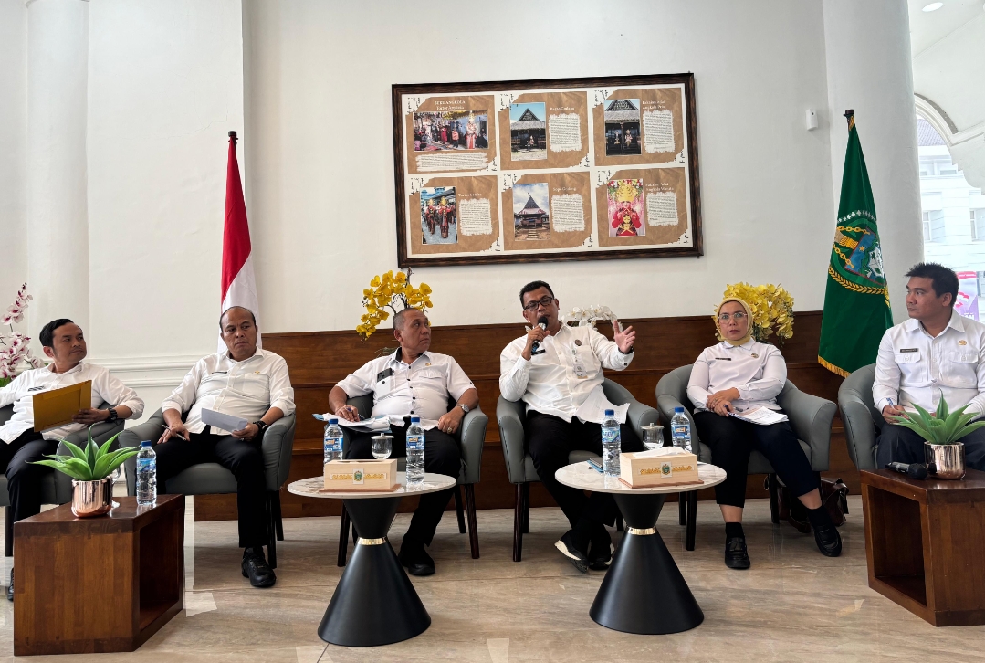Kepala BPBD Sumut Tuahta Ramajaya Saragih bersama para jajaran dalam temu pers, Rabu (8/10/2025). (dok/infrasumut)