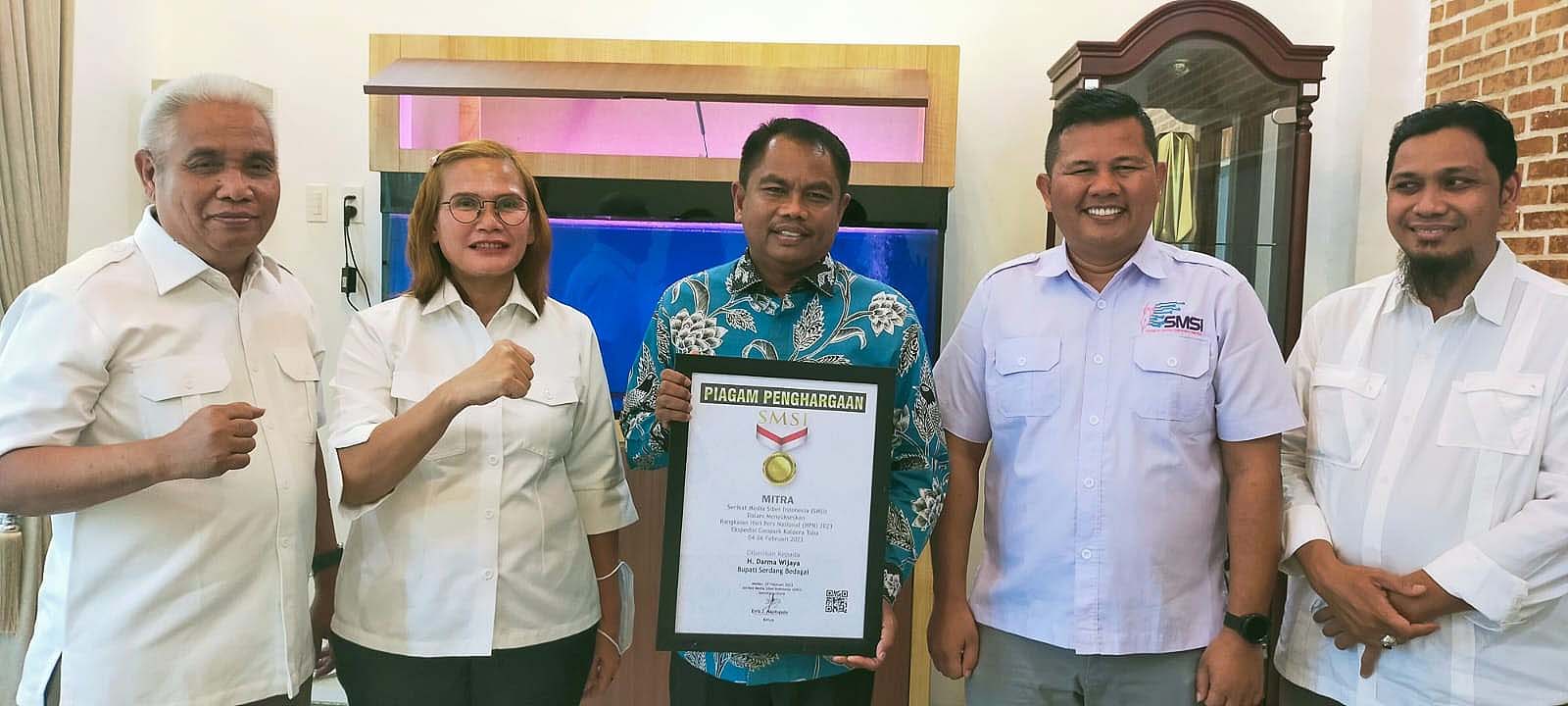 Bupati Sergai Darma Wijaya terima penghargaaan dari SMSI. (istimewa)