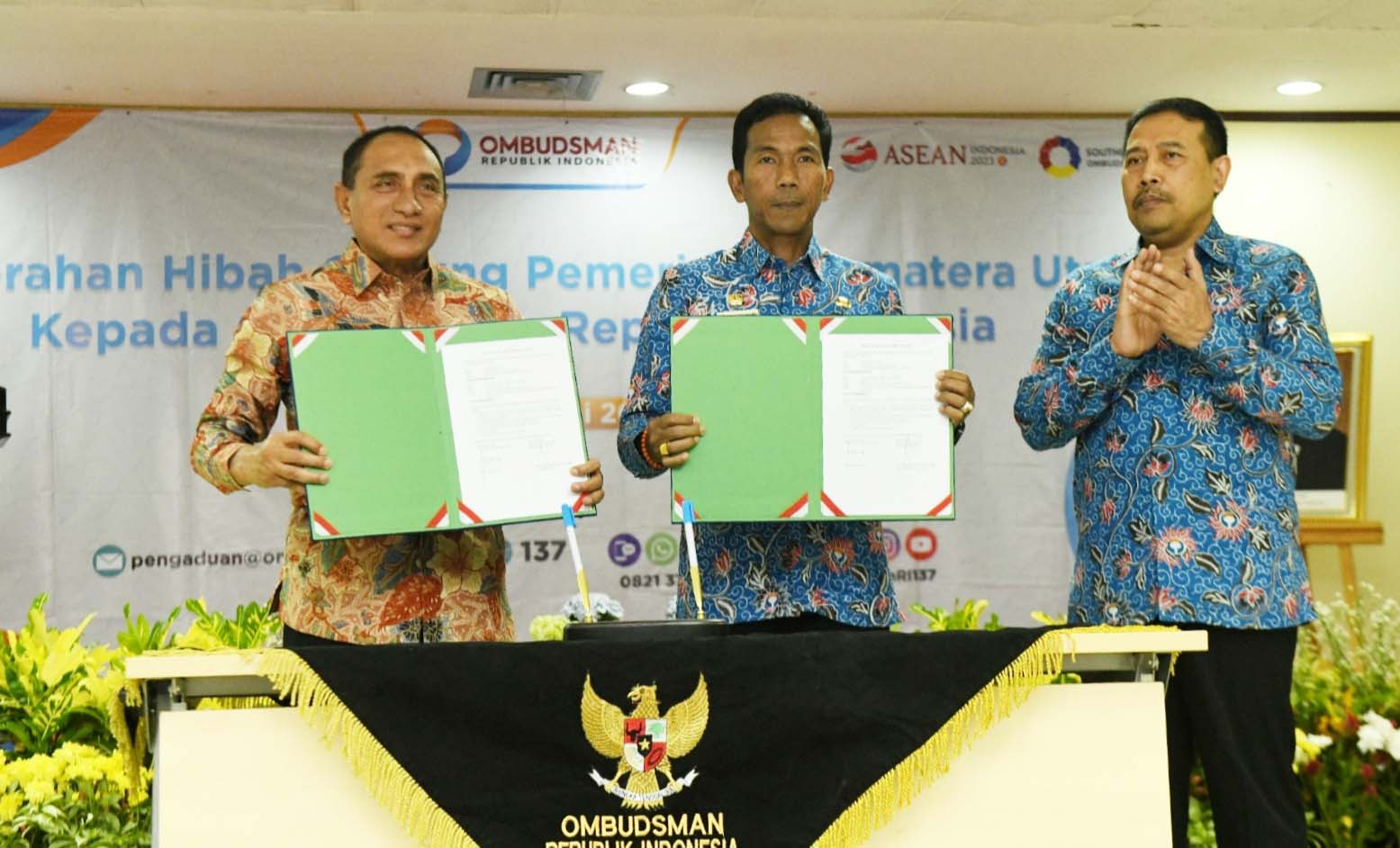 Gubernur Sumut, Edy Rahmayadi, menyerahkan SK Hibah Gedung Pemprov ke Ombudsman RI, Selasa (06/06/2023). (istimewa)