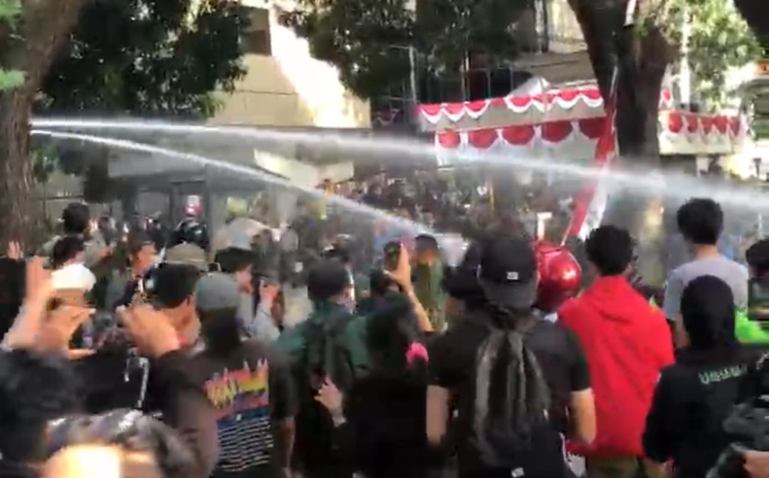 “Kami datang menyampaikan aspirasi, bukan untuk dipukuli!,” teriak seorang mahasiswa dari atas mobil komando.
