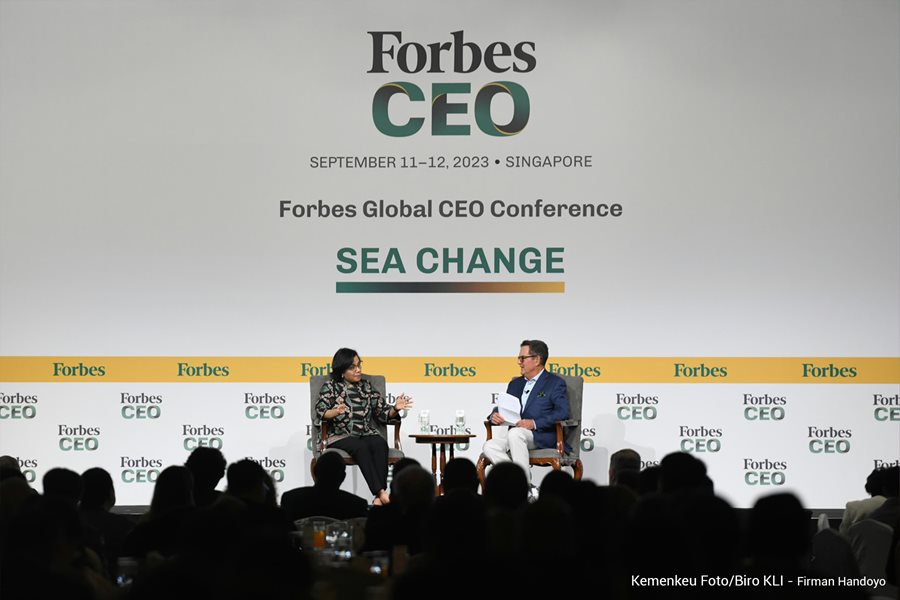 Menkeu Sri Mulyani berbicara pada Forbes Global CEO Conference 2023 di Singapura, Senin (11/09/2023). (dok )