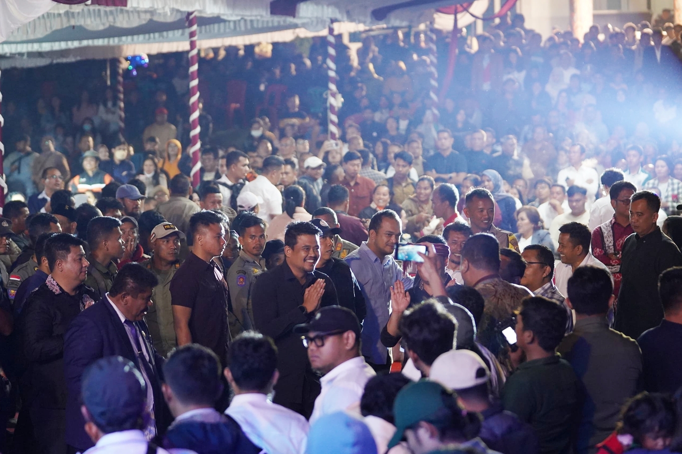 Gubernur Sumut Bobby Nasution didampingi Ketua TP PKK Sumut Kahiyang Ayu beserta sejumlah OPD Pemprov Sumut menghadiri Hari Jadi ke-22 Humbahas, di Lapangan Kompleks Perkantoran Bukit Inspirasi, Dolok Sanggul, Senin (28/7/2025) malam. (istimewa)