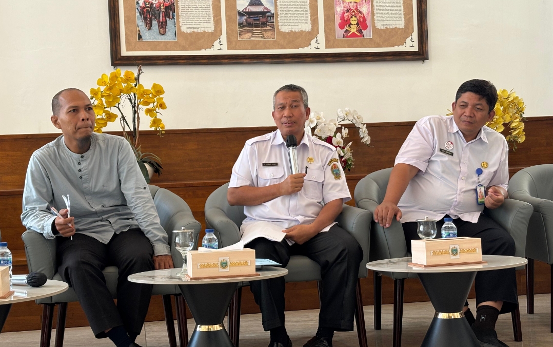 Sekretaris Dinas Perpusip Sumut Alpian Hutagalung bersama Kasubbag Umum Idhamsyah, memberi keterangan kepada wartawan, Rabu (29/10/2025). (dok/infrasumut)