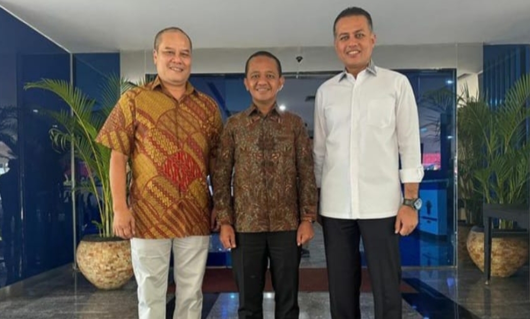 Ketua DPD Golkar Sumut Musa Rajekshah dan Sekretaris Datok Ilhamsyah foto bersama dengan Calon Ketua Umum Golkar Bahlil Lahadalia. (istimewa)