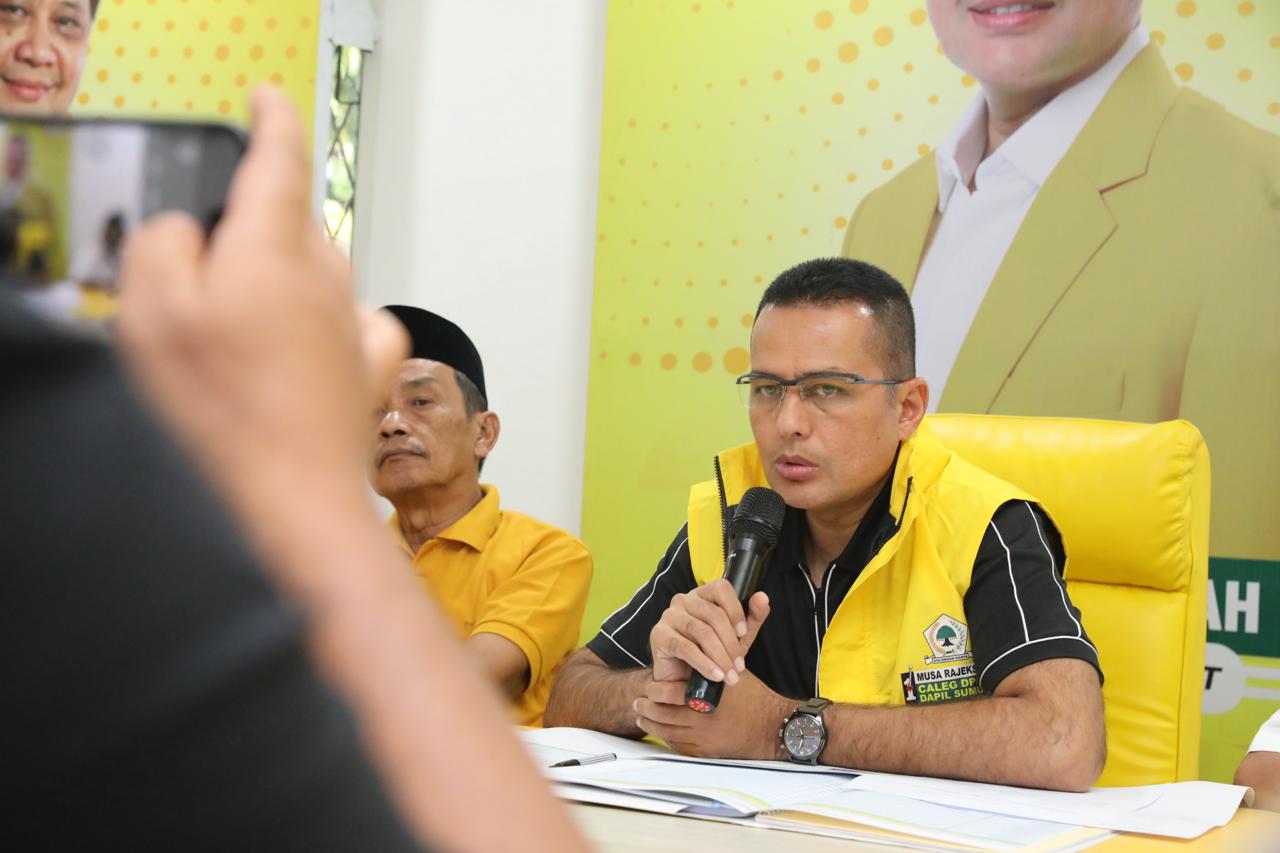 Ketua DPD Partai Golkar Sumut Musa Rajekshah memberikan keterangan hasil Pileg dan Pilpres 2024, Senin (25/3/2024). (istimewa)