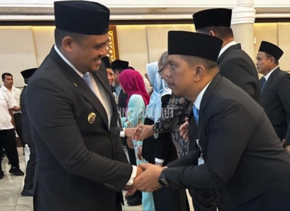Gubernur Sumut Bobby Nasution menyalami Dedi Jaminsyah Harahap usai melantiknya menjadi Kadisperindag ESDM Sumut, Senin (9/3/2026). (dok/infrasumut)