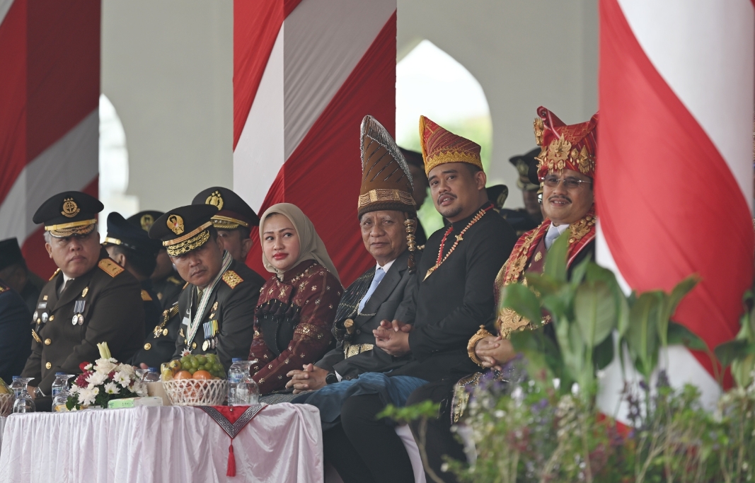 Gubernur Bobby Nasution pada upacara tersebut mengenakan baju adat Pakpak, lengkap dengan bulang-bulang (penutup kepala) berwarna merah.
