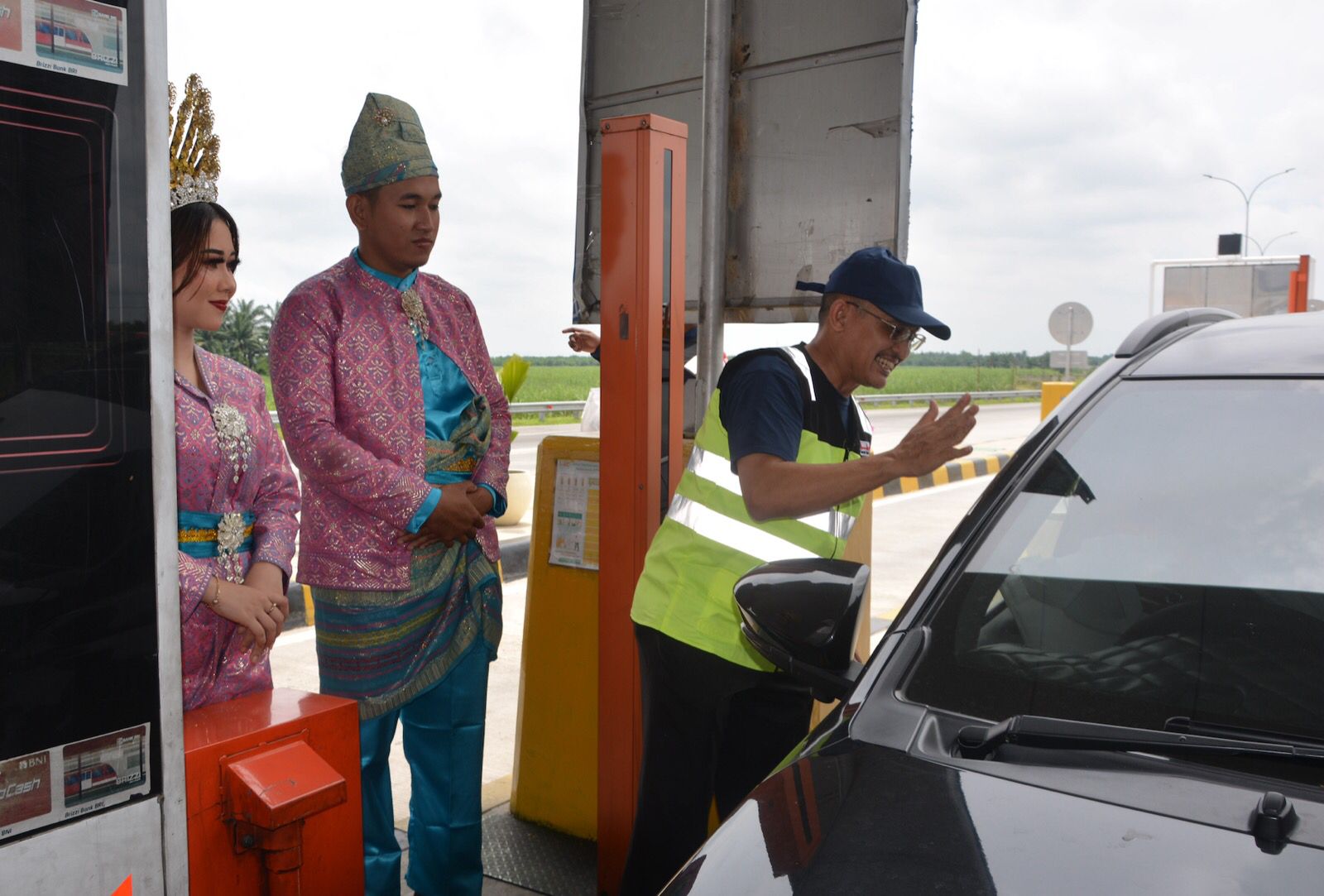 Hutama Karya selain perayaan HUT ke-78 RI, juga membagikan merchandise gratis kepada pengguna di Tol Binjai-Langsa Seksi Binjai-Stabat, Kamis (17/08/2023). (istimewa)