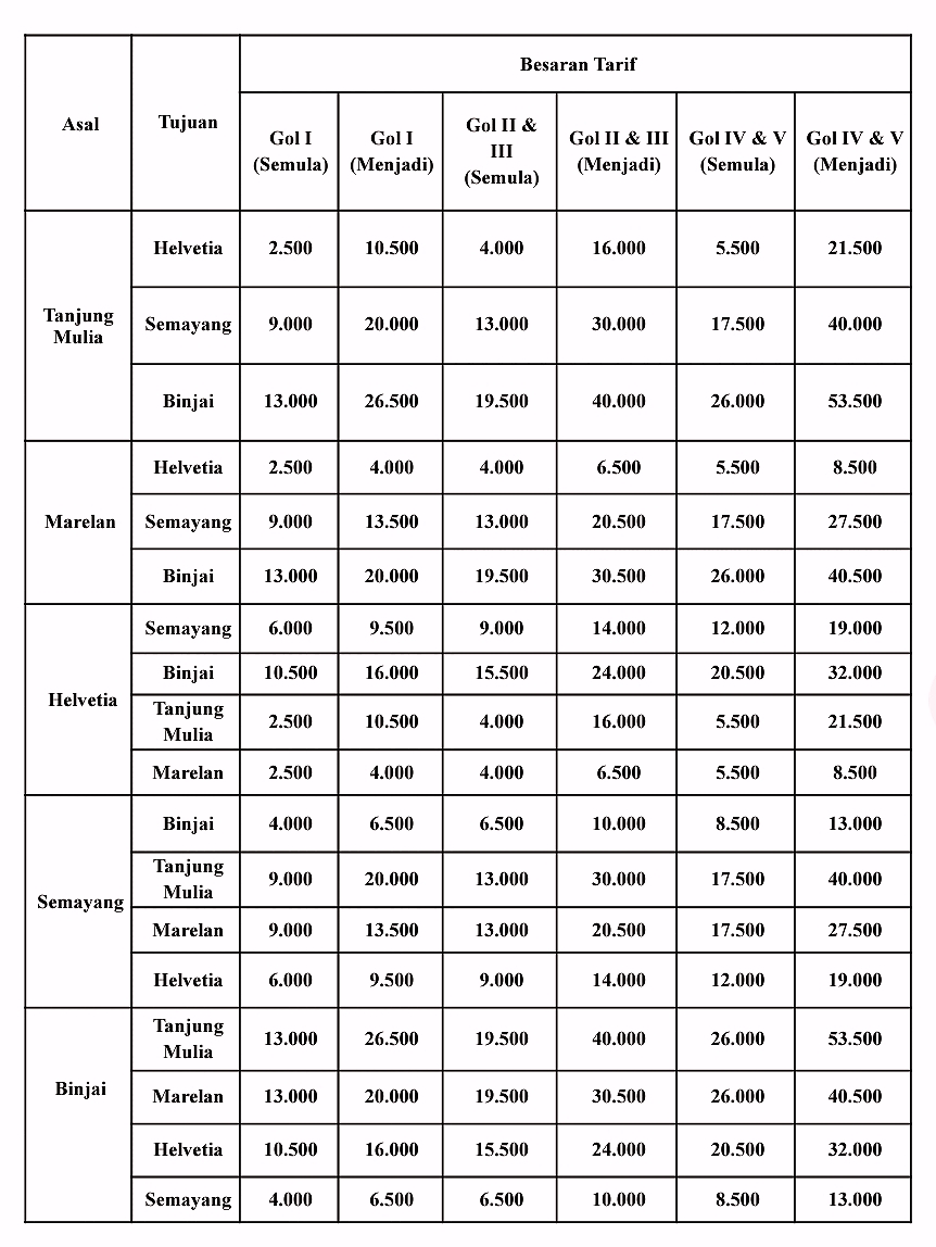 Hal itu diatur dalam SK Menteri Pekerjaan Umum dan Perumahan Rakyat (PUPR) Nomor 456/KPTS/M/2023 tentang Penetapan Besaran tarif Jalan Tol Medan-Binjai pada tanggal 18 April 2023.