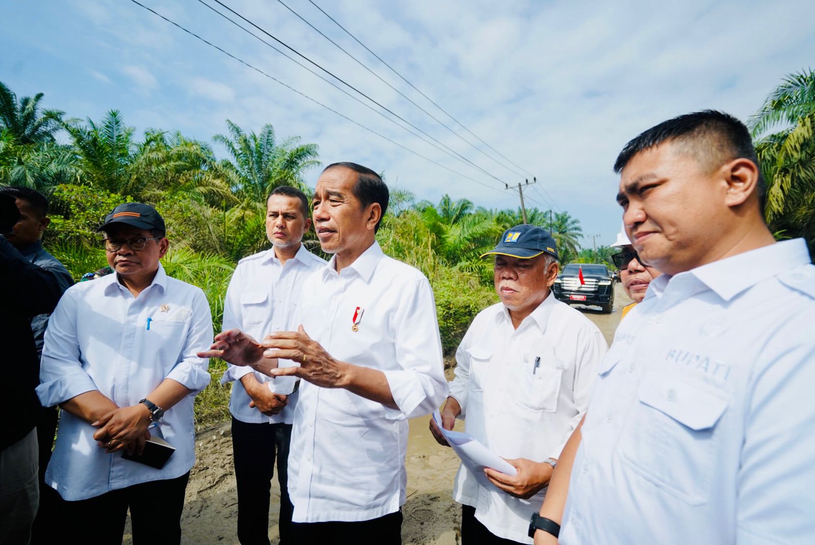 Presiden Jokowi didampingi Menteri PUPR, Basuki Hadimuljono, Wakil Gubernur Sumut, Musa Rajekshah, dan Bupati Labura, Hendriyanto Sitorus, Presiden Jokowi menknjau jalan rusak di Labura itu.