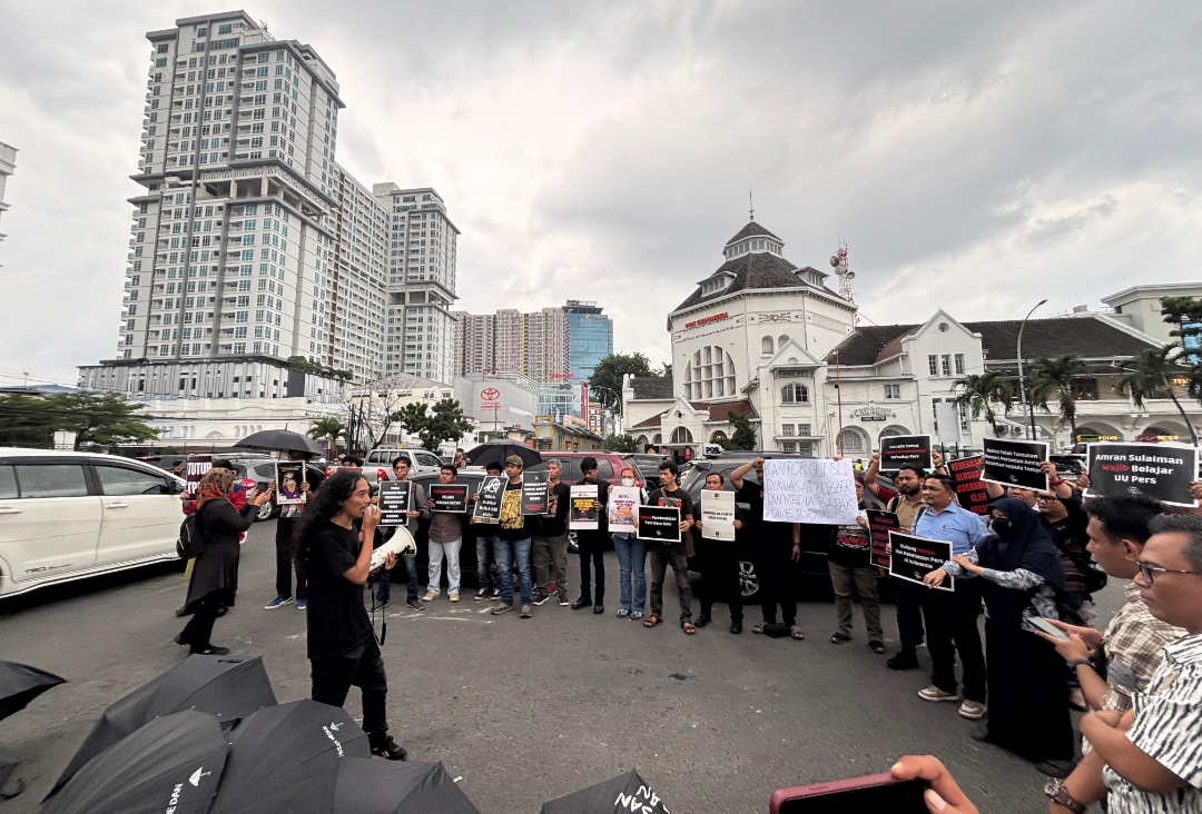 Jurnalis di Medan menggelar aksi solidaritas di depan Pos Blok, Kamis (6/11/2025) sore, menolak gugatan Mentan Amran Sulaiman terhadap Tempo. (dok/infrasumut)