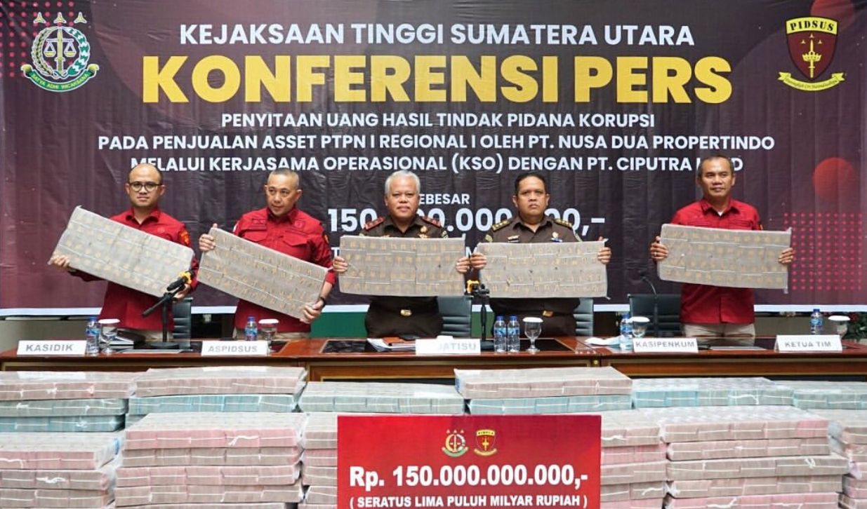 InfraSumut.com – Medan. Kejaksaan Tinggi Sumatera Utara memperlihatkan uang sitaan senilai Rp 150 miliar dari kasus dugaan tindak pidana korupsi pada pengelolaan/penjualan/pengalihan aset PTPN I Regional I oleh PT Nusa Dua Propertindo (NDP) untuk pembangunan perumahan Citraland.