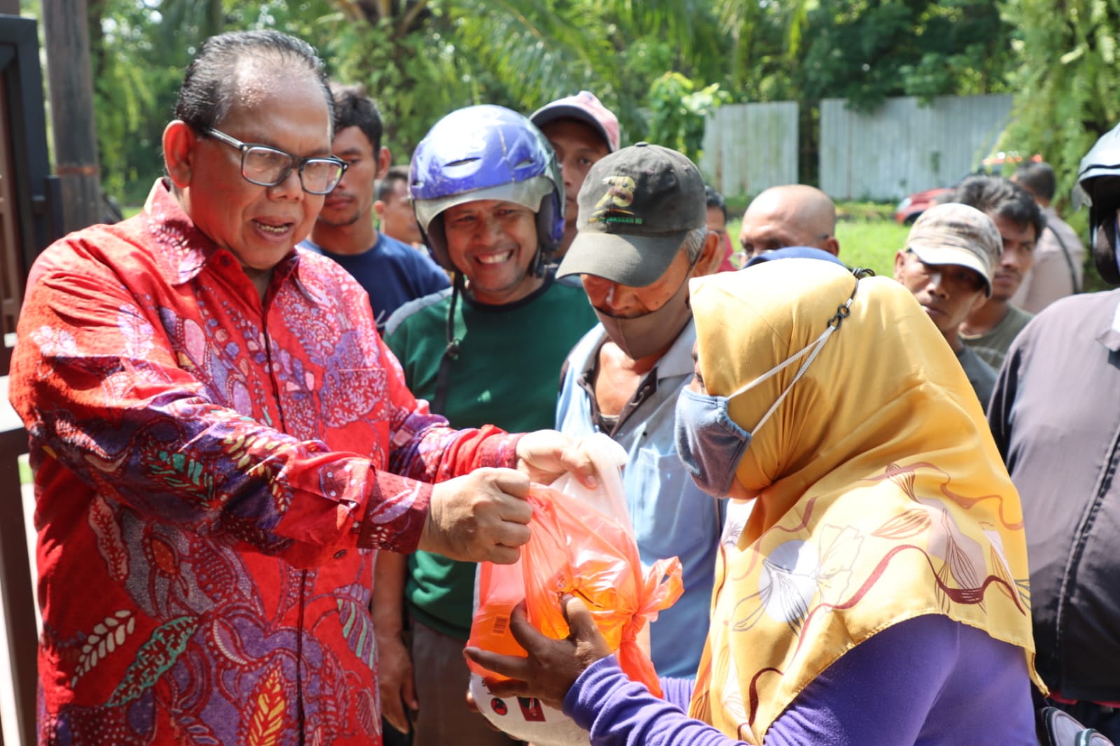 Ketua DPRD Sumut, Baskami Ginting, membagikan paket sembako kepada warga yang berprofesi satpam, tukang kebun, ojol dan petugas kebersihan, Sabtu (15/04/2023). (istimewa)