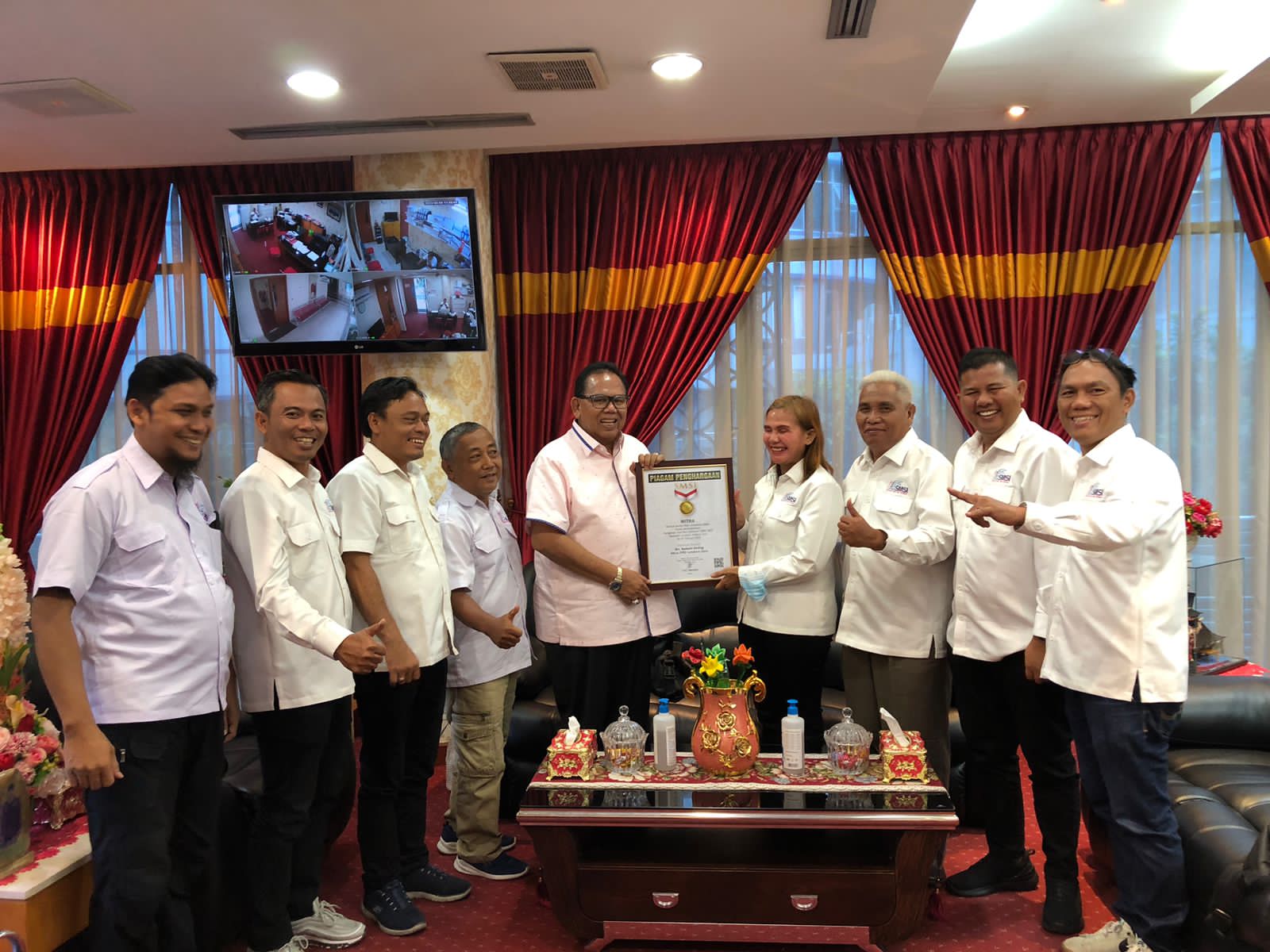 Di akhir kunjungan silaturahmi, Ketua Erris J Napitupulu menyerahkan penghargaan Mitra SMSI kepada Ketua DPRD Baskami Ginting, yang dalam kapasitasnya sebagai pimpinan dewan, dinilai ikut memberi kontribusi positif terhadap perkembangan pers di Sumut, juga secara umum terhadap pembangunan Sumut.