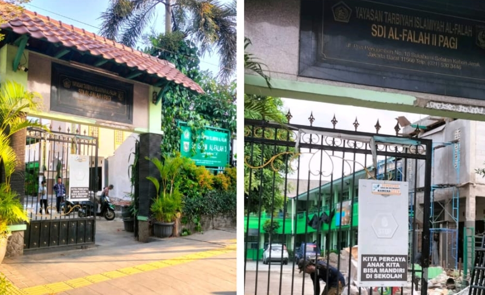 Izin operasional SDI Al Falah 02/03 Pagi dilaporkan kedaluwarsa sejak 30 Juni 2016. Demikian pula status hukum YTIA dengan nomor AHU-991.AH.01.04 Tahun 2011 dipertanyakan keabsahannya. - Pembangunan Tanpa Izin