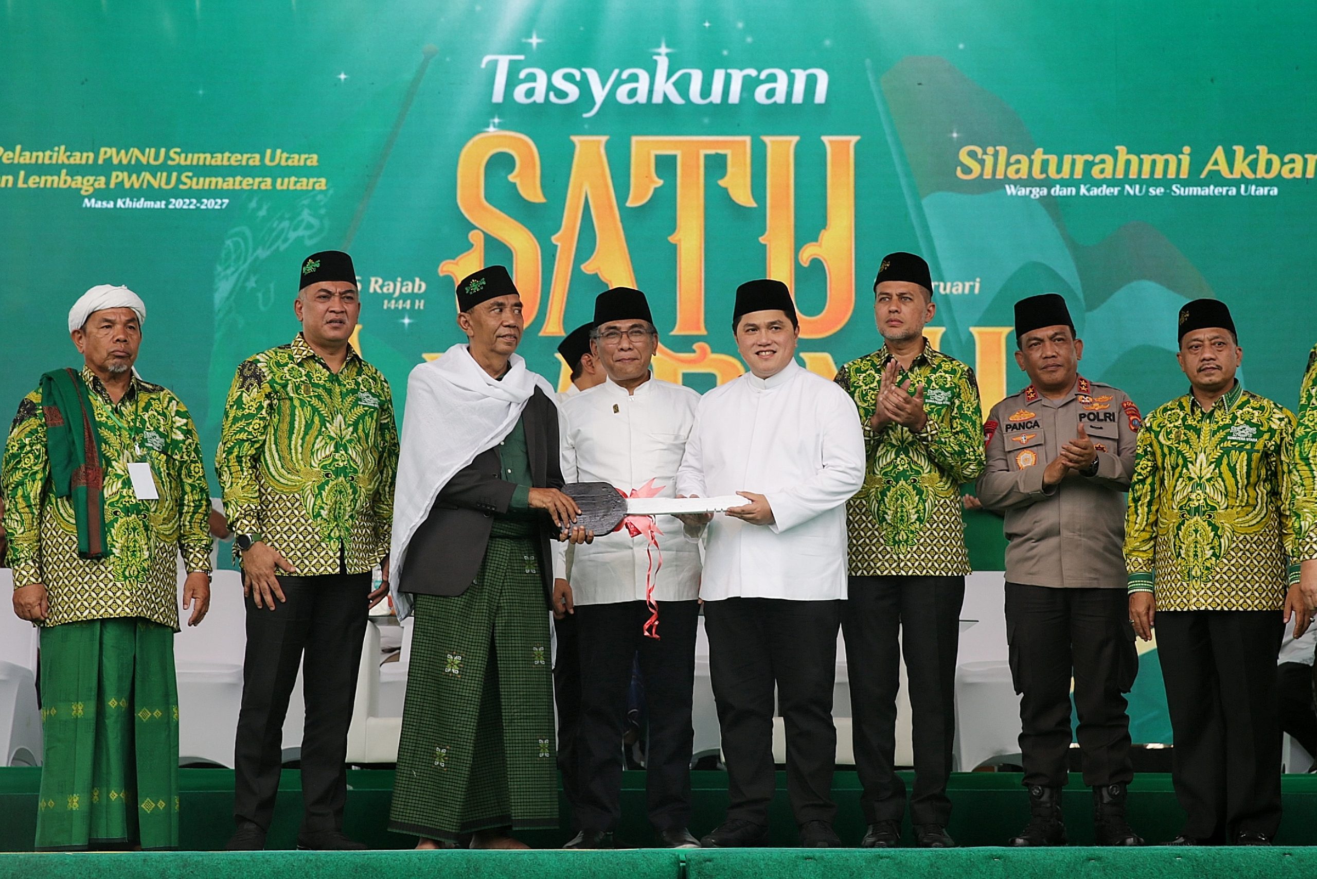 Ketum PBNU Yahya Cholil Staquf, Menteri BUMN Erick Thohir, Wagub Sumut Musa Rajekshah, menghadiri Tasyakuran 1 Abad NU di Pelataran Ponpes Musthafawiyah, di Desa Purba Baru, Madina, Kamis (18/05/2023). (istimewa)