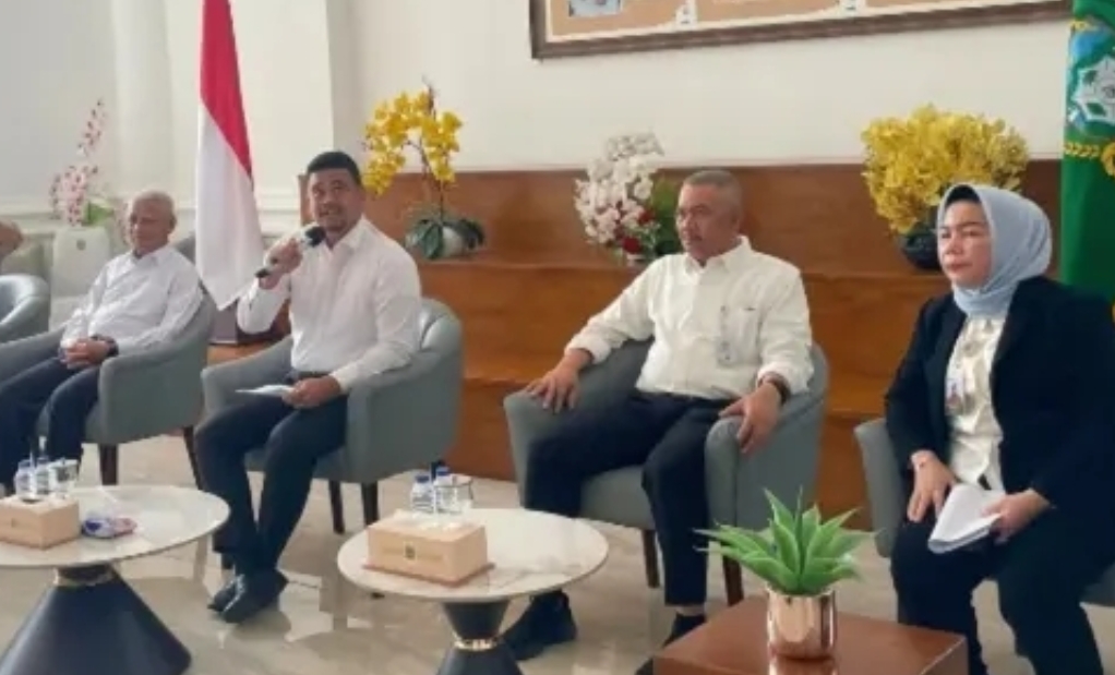 Gubernur Sumut Bobby Nasution bersama Wakil Gubernur Surya, Pj Sekdaprov Sulaiman Harahap dan Kadisnaker Yuliani Siregar memberi keterangan kepada wartawan belum lama ini. (dok/istimewa)