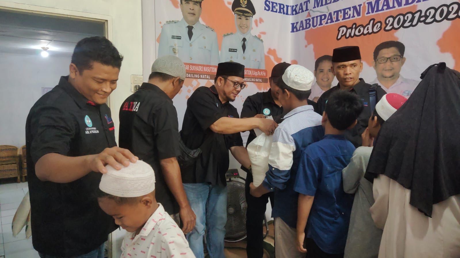 Keluarga besar SMSI Madina ketika memberikan santunan Kepada anak yatim di sekretariat SMSI Madina Komplek Cemara Madina Blok A2, Sabtu (15/04/2023). (istimewa)