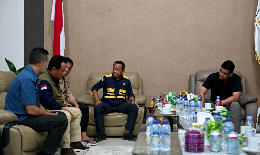 Menteri Bahlil Lahaladia bersama Bobby Nasution, Bupati Masinton Pasaribu, dan Dirut Pertamina Patra Niaga Mars Ega Legowo Putra, Anggota DPR RI Musa Rajekshah, saat rapat darurat banjir dan longsor di Tapteng, di Kantor Bupati Tapteng, Selasa (2/12/2025). (dok/kominfosu)