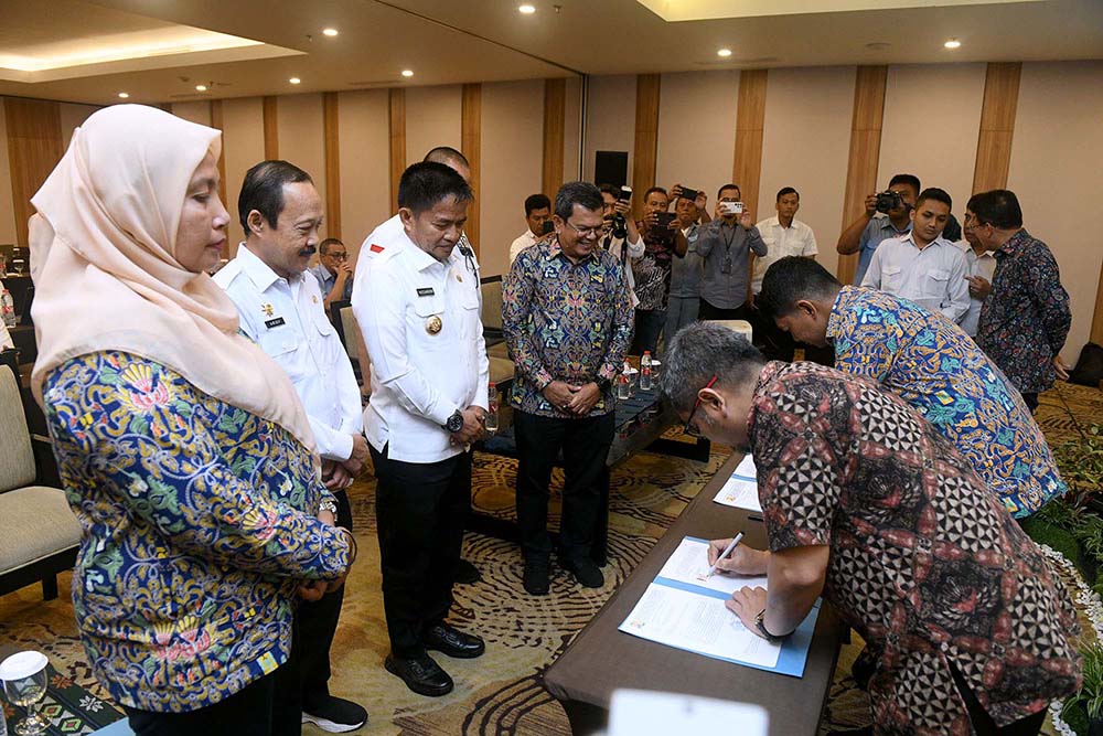 Pj Gubsu Hassanudin menyaksikan penandatanganan kontrak pembangunan Stadion Utama Sumut di Hotel Santika Medan, Rabu (20/09/2023). (istimewa)
