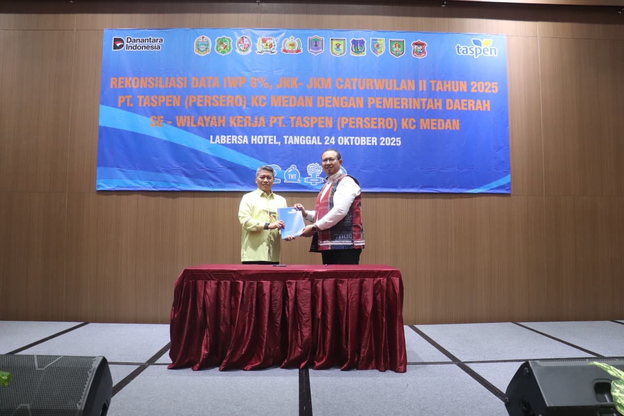 Penyerahan penghargaan dilaksanakan saat Rekonsiliasi Data IWP 8%, JKK-JKM Caturwulan II Tahun 2025 di Hotel Labersa, Balige, Jumat (24/10/2025).