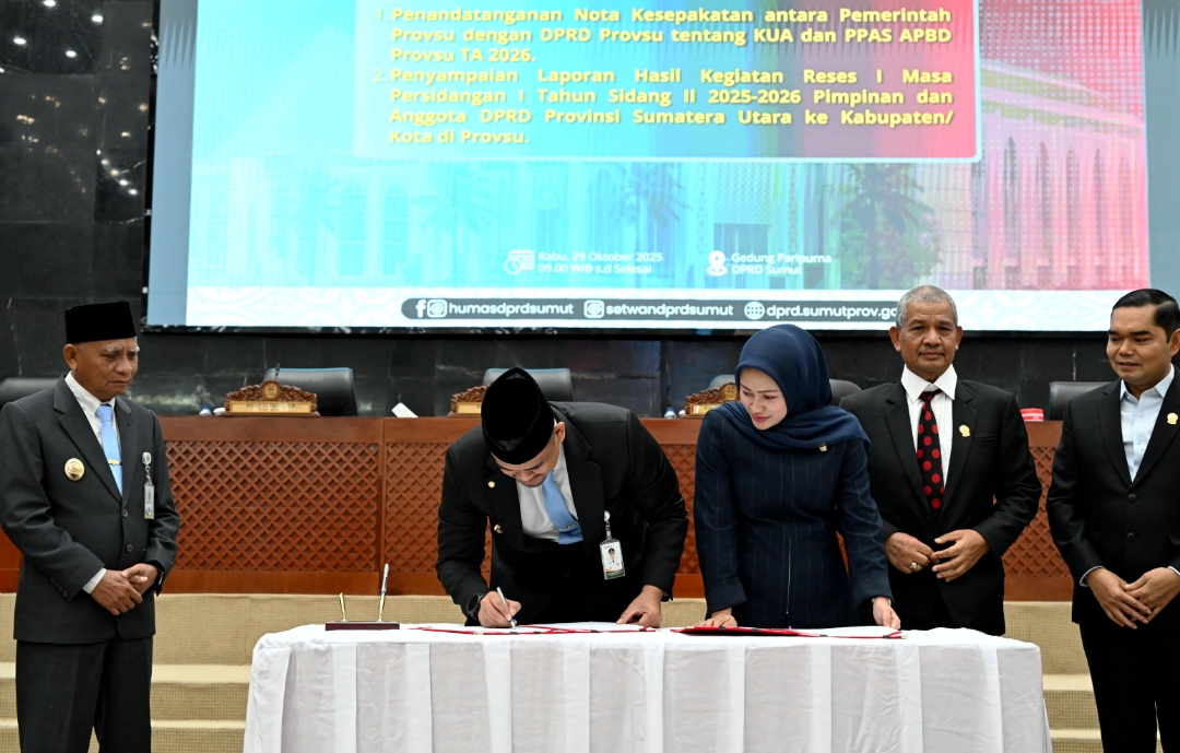 Penandatanganan Nota Kesepakatan dilakukan dalam Rapat Paripurna, di Gedung DPRD Sumut, Jalan Imam Bonjol, Medan, Rabu (29/10/2025).