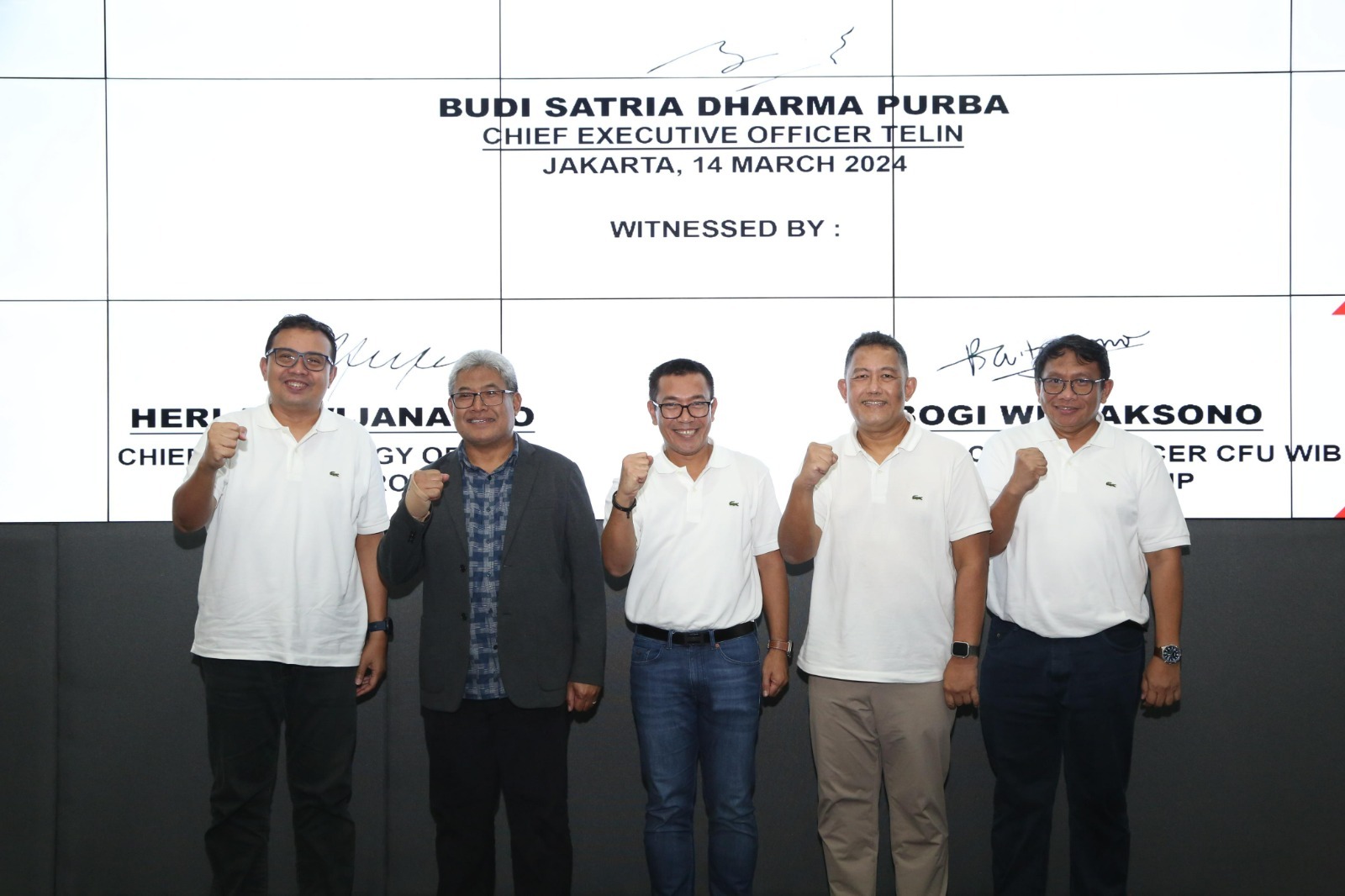 Direktur Wholesale & International Service Telkom, Bogi Witjaksono (dua kanan), Direktur Network & IT Solution Telkom, Herlan Wijanarko (dua kiri), CEO Teli Budi Satria Dharma Purba (tengah), CFRO Telin Doni Andriansyah (paling kiri) dan CTO Telin Akhmad Ludfy (paling kanan) saat peresmian Telin Operation and Command Center (TOCC) beberapa waktu lalu. (dok telkom)