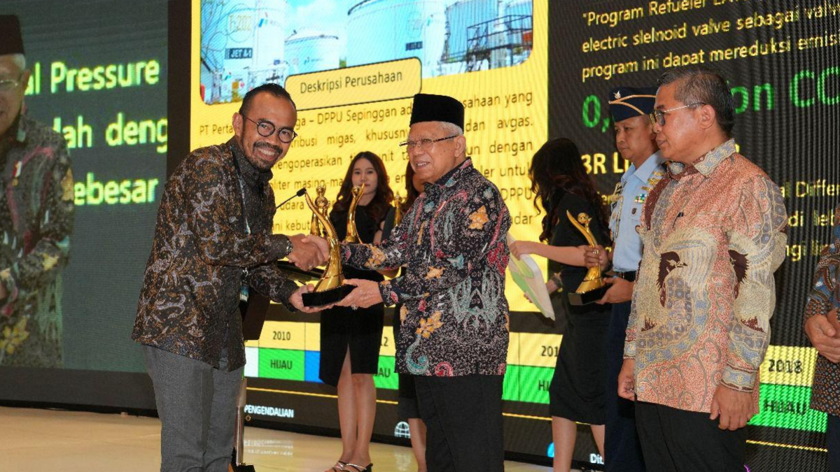 Wapres Ma’ruf Amin menyerahkan penghargaan Proper Emas ke Pertamina Patra Niaga Regional Sumbagut di Jakarta, Selasa (20/12/2023). (istimewa)