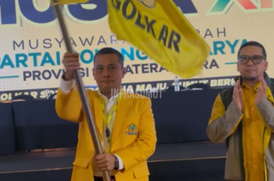 Andar Amin Harahap mengibarkan pataka Partai Golkar usai terpilih menjadi Ketua DPD Golkar Sumut periode 2025-2030. (dok/infrasumut)