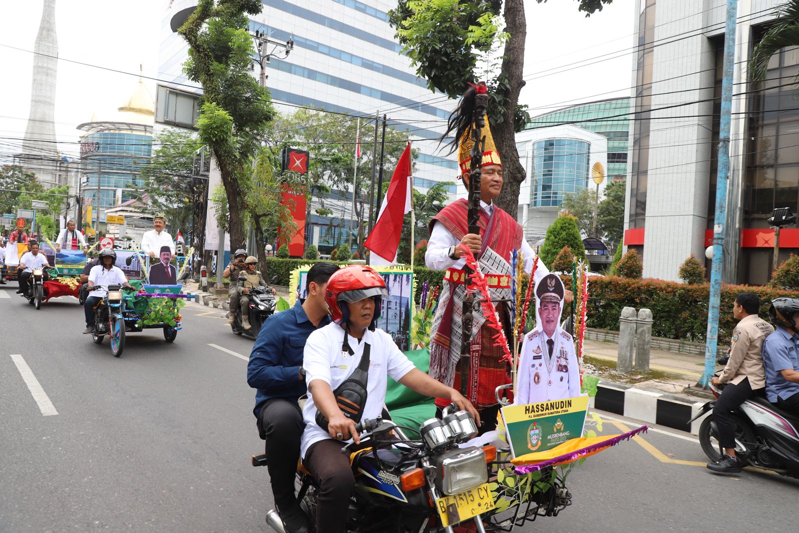 Pj Gubsu Hassanudin berada di posisi paling depan, diikuti Sekdaprov Sumut Arief S Trinugroho, yang memakaikan baju adat Melayu. Selanjutnya rombongan bupati dan wali kota mengikuti dari belakang.