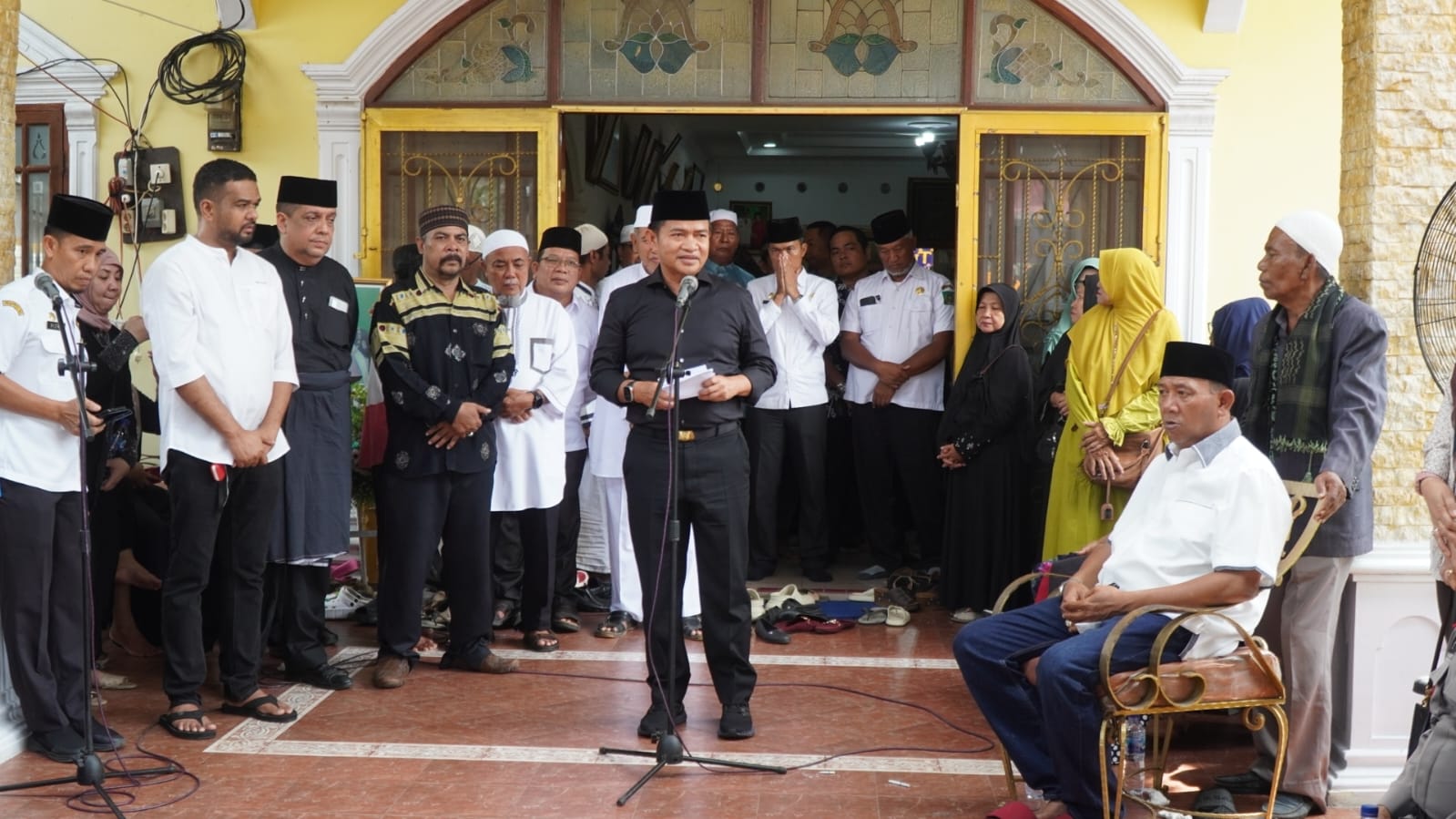 Pj Gubsu Hassanudin melayat ke rumah duka Almarhum Dato’ Seri Syamsul Arifin (Gubernur Sumut 2008-2011), di Jalan Stasiun Pangkalan Brandan, Kabupaten Langkat, Rabu (18/10/2023). (istimewa)