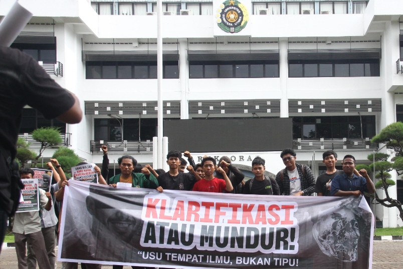 Aksi tersebut juga menyoroti dugaan keterlibatan Rektor USU, Prof Muryanto Amin, dalam pembahasan pergeseran anggaran Pemerintah Provinsi Sumatera Utara bersama sejumlah pihak yang saat ini tengah diperiksa Komisi Pemberantasan Korupsi (KPK).