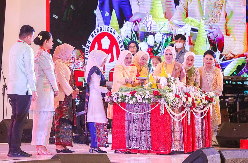 InfraSumut com – Medan. Ibu Negara Iriana Jokowi memotong nasi tumpeng bentuk rasa syukur pada puncak Peringatan HUT ke-43 Dewan Kerajinan Nasional (Dekranas) tahun 2023, di Ballroom Hotel Santika Medan, Selasa (16/05/2023).