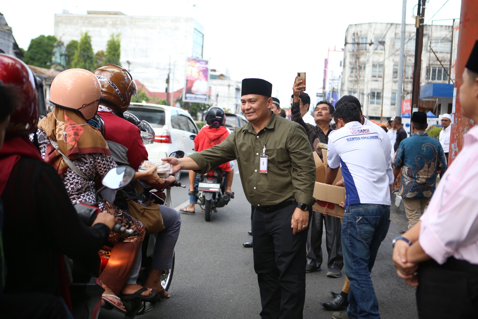 Takjil dibagikan kepada pengendara yang melintas di depan Kantor Bank Sumut Pematangsiantar, Jalan Merdeka. Tampak masyarakat menerimanya dengan senyum bahagia.