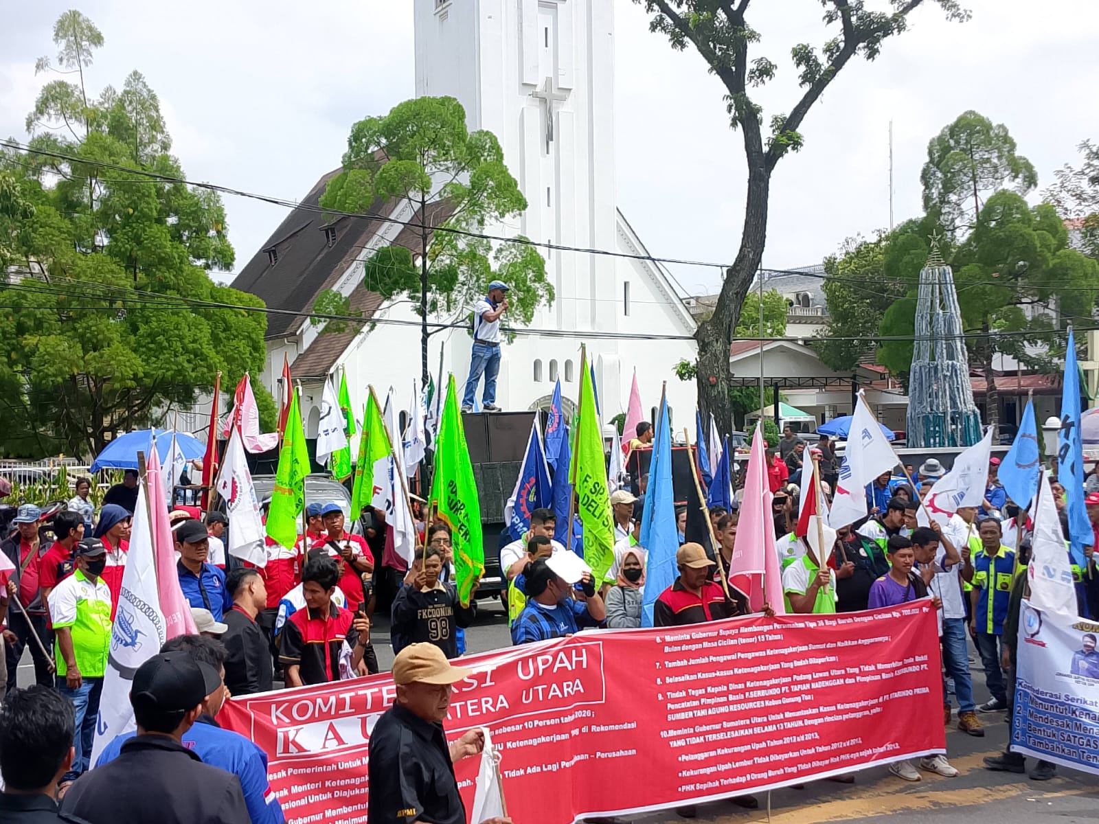 Kordinator Aksi Johan Merdeka dalam orasinya mengatakan, para buruh menyampaikan sepuluh tuntutan utama yang mereka nilai penting untuk segera direalisasikan oleh pemerintah pusat maupun daerah.
