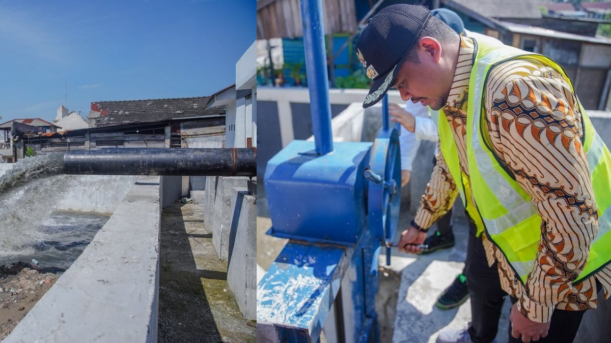 Bobby Nasution, menantu Presiden RI Joko Widodo tersebut, melihat tempat pembuangan air di rumah pompa Zona A tersebut.