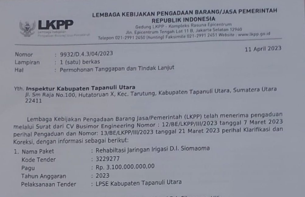 LKPP RI menyurati Inspektur Tapanuli Utara untuk menanggapi dan menindaklanjuti pengaduan CV Busimor Engineering terkait syarat tambahan pada tender 2 paket jaringan irigasi di Pemkab Taput. (screenshoot)