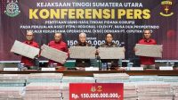 Kajati Sumut Harli Siregar memperlihatkan uang Rp 150 miliar hasil sitaan, Rabu (22/10/2025). (dok/kejatisu) Baca Juga