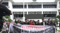 Puluhan mahasiswa berunjuk rasa di depan Biro Rektorat Universitas Sumatera Utara (USU), Senin (13/10/2025). Baca Juga