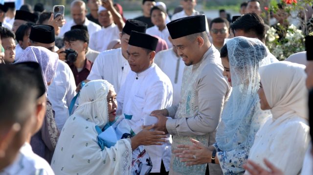 Gubernur Sumut Bobby Nasution bersama Bupati Sergai Dharma Wijaya disalami warga usai melaksanakan Salat Baca Juga