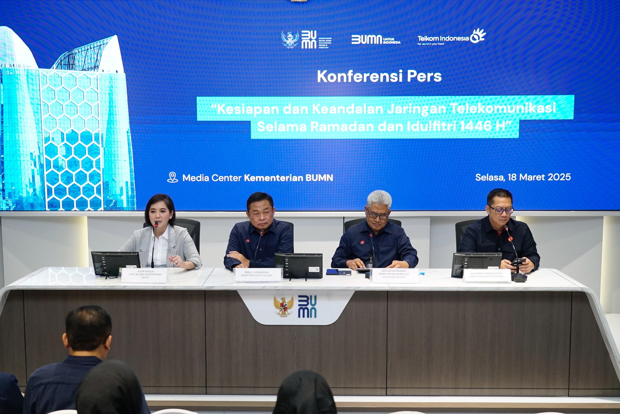 Jubir Kementerian BUMN RI Putri Violla (paling kiri), Direktur Utama Telkom Ririek Adriansyah (dua kiri), Direktur Network and IT Solution Telkom Herlan Wijanarko (dua kanan), dan Direktur Sales Telkomsel Adiwinahyu Basuki Sigit (paling kanan) saat konferensi pers Kesiapan TelkomGroup dalam rangka Ramadan dan Idulfitri (RAFI) 2025 di Kementerian BUMN RI, pada Selasa (18/3/2025). (dok telkom)