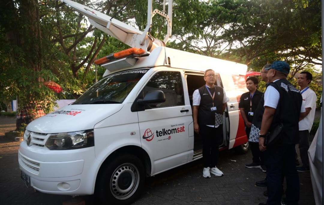 SVP Corporate Communication & Investor Relation Telkom, Ahmad Reza (paling kiri) memastikan kesiapan Satellite News Gathering milik Telkomsat dalam momen KTT AIS 2023 Forum, di Nusa Dua, Selasa (10/10/2023). (dok telkom)