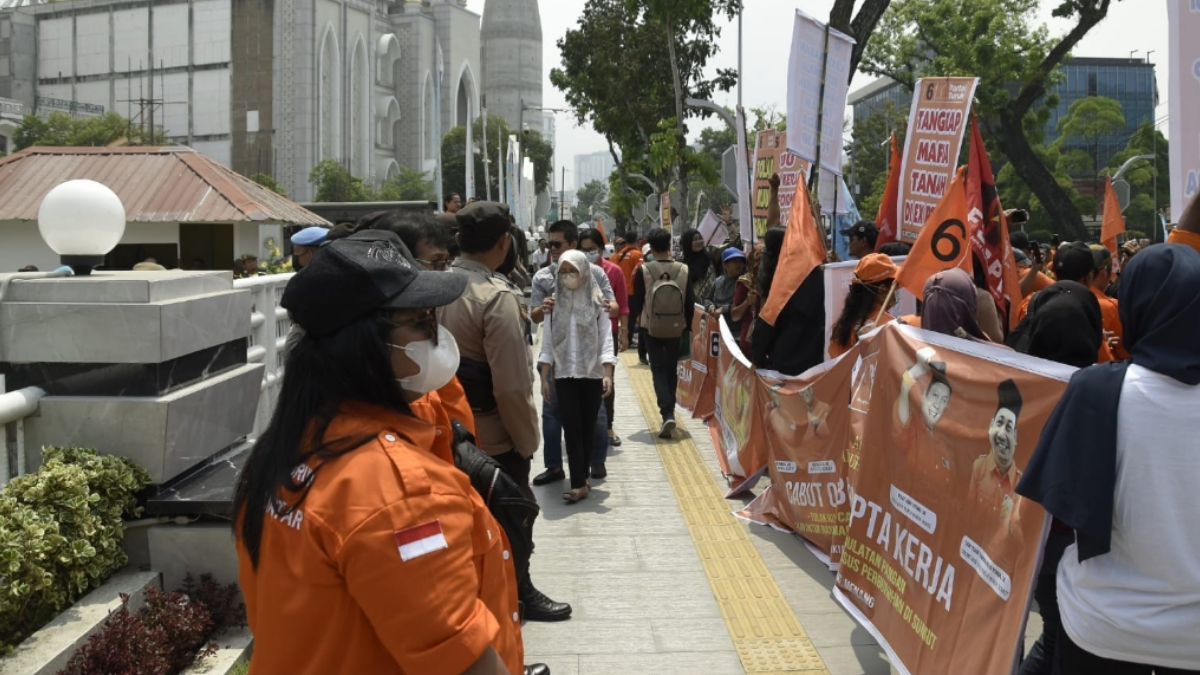 InfraSumut.com – Medan. Partai Buruh bersama sejumlah elemen serikat buruh di Sumatera Utara menggelar unjuk rasa di Kantor Gubernur Sumut, di Jalan Diponegoro, Kota Medan, Kamis (22/06/2023).
